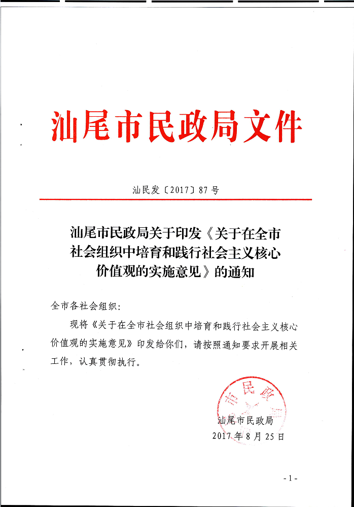 汕尾市民政局关于印发《关于在全市社会组织中培育和践行社会主义核心价值观的实施意见》的通知