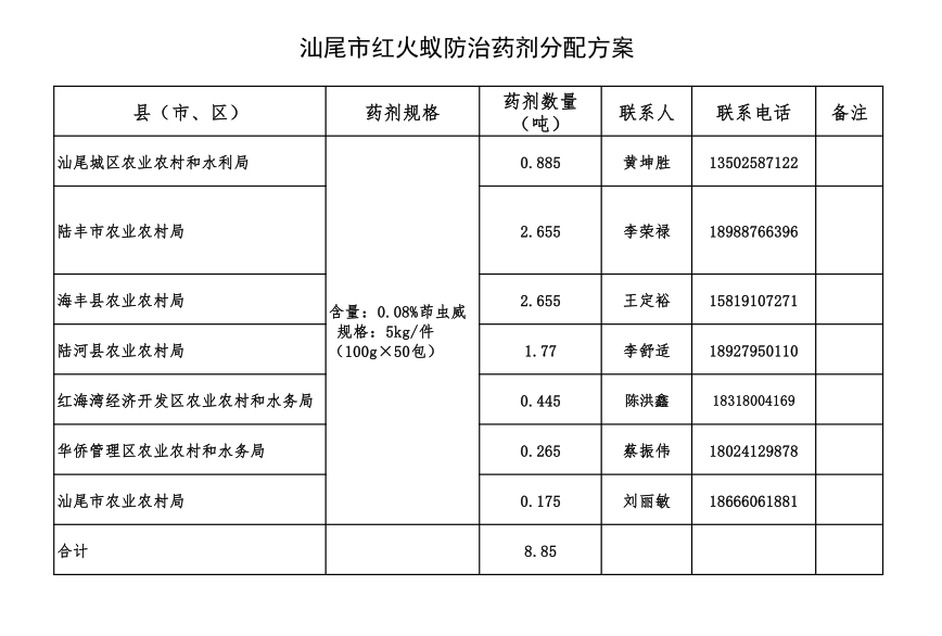 关于汕尾市红火蚁防治药剂分配方案的公告