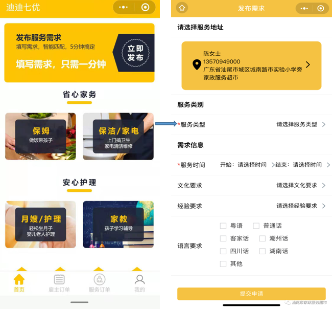 打开“善美村居”小程序,点击“服务专区”,点击“汕尾人社服务专区”板块,点击“我要家政服务”的专题模板,专题提供保姆、保洁/家电、月嫂/护理、家教等各类家政服务,您可根据您的需要,自主选择服务类型,点击后,将跳转“迪迪七优”办理。