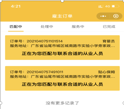 点击功能栏中的雇主订单,查看订单详细状态,等待系统根据订单需求完成匹配。