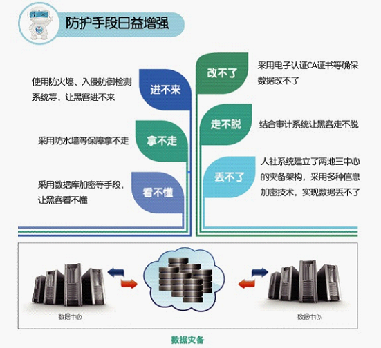 丢不了:人社系统建立了两地三中心的灾备架构,采用多种信息加密技术,实现数据丢不了。