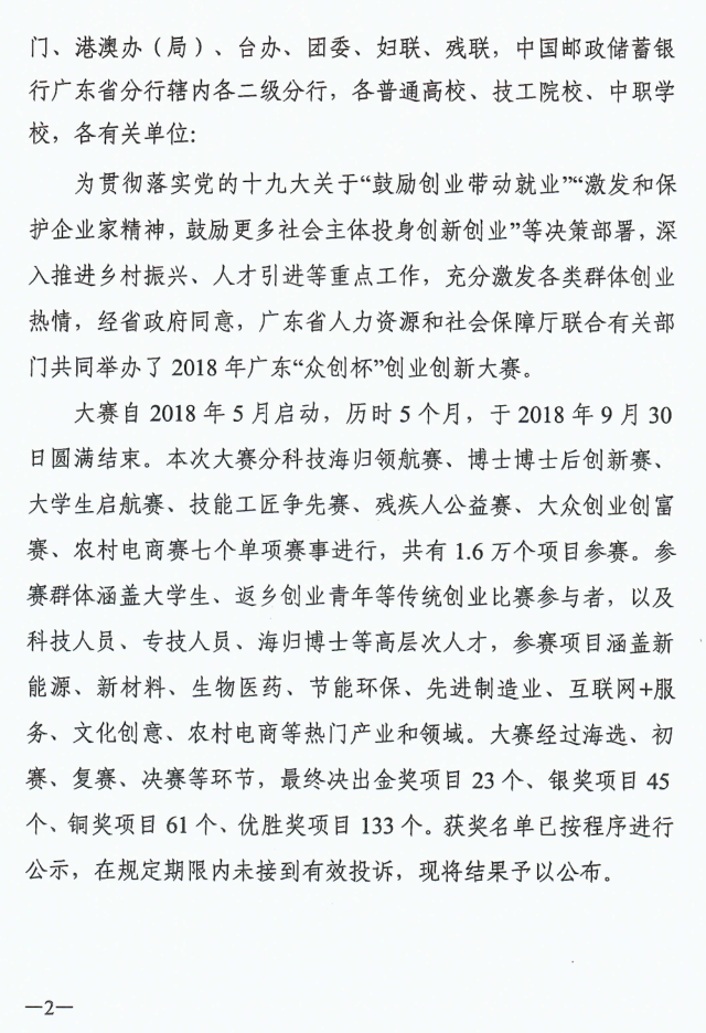 关于公布2018年广东“众创杯”创业创新大赛获奖名单的通知