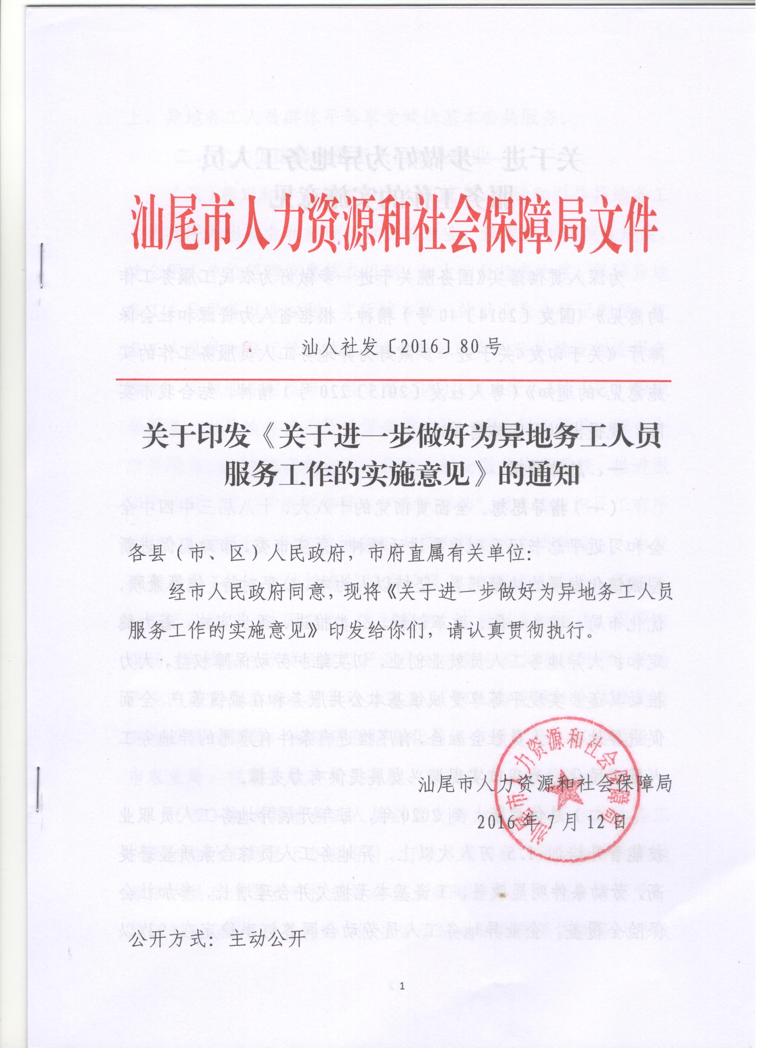 障厅《关于印发<关于进一步做好为异地务工人员服务工作的实施意见>的通知》(粤人社发〔2015〕220号)精神,结合我市实际,现提出以下实施意见。