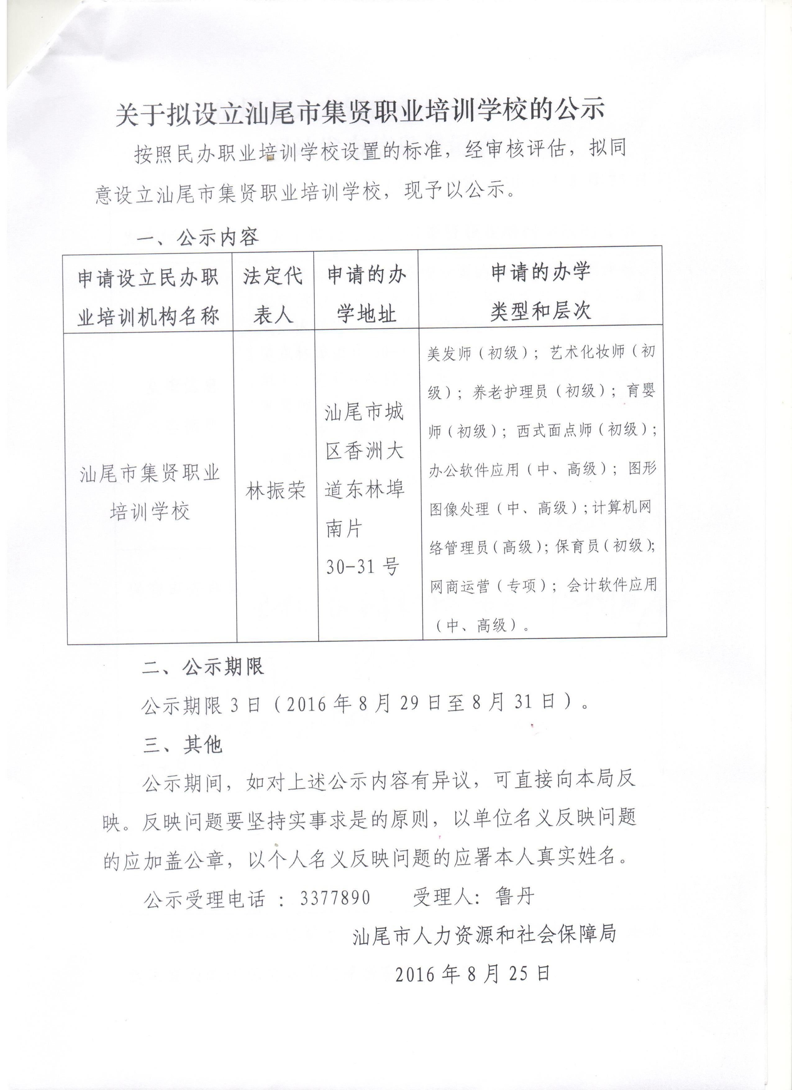 关于拟设立汕尾市集贤职业培训学校的公示