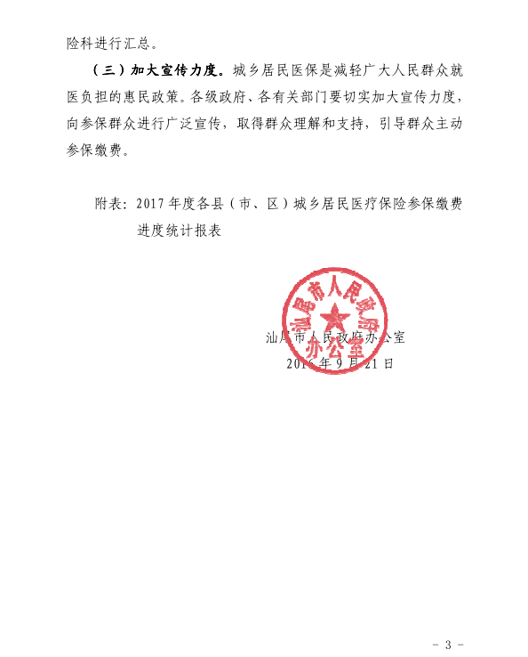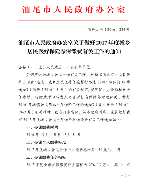 汕尾市人民政府办公室关于做好2017年度城乡居民医疗保险参保缴费有关工作的通知