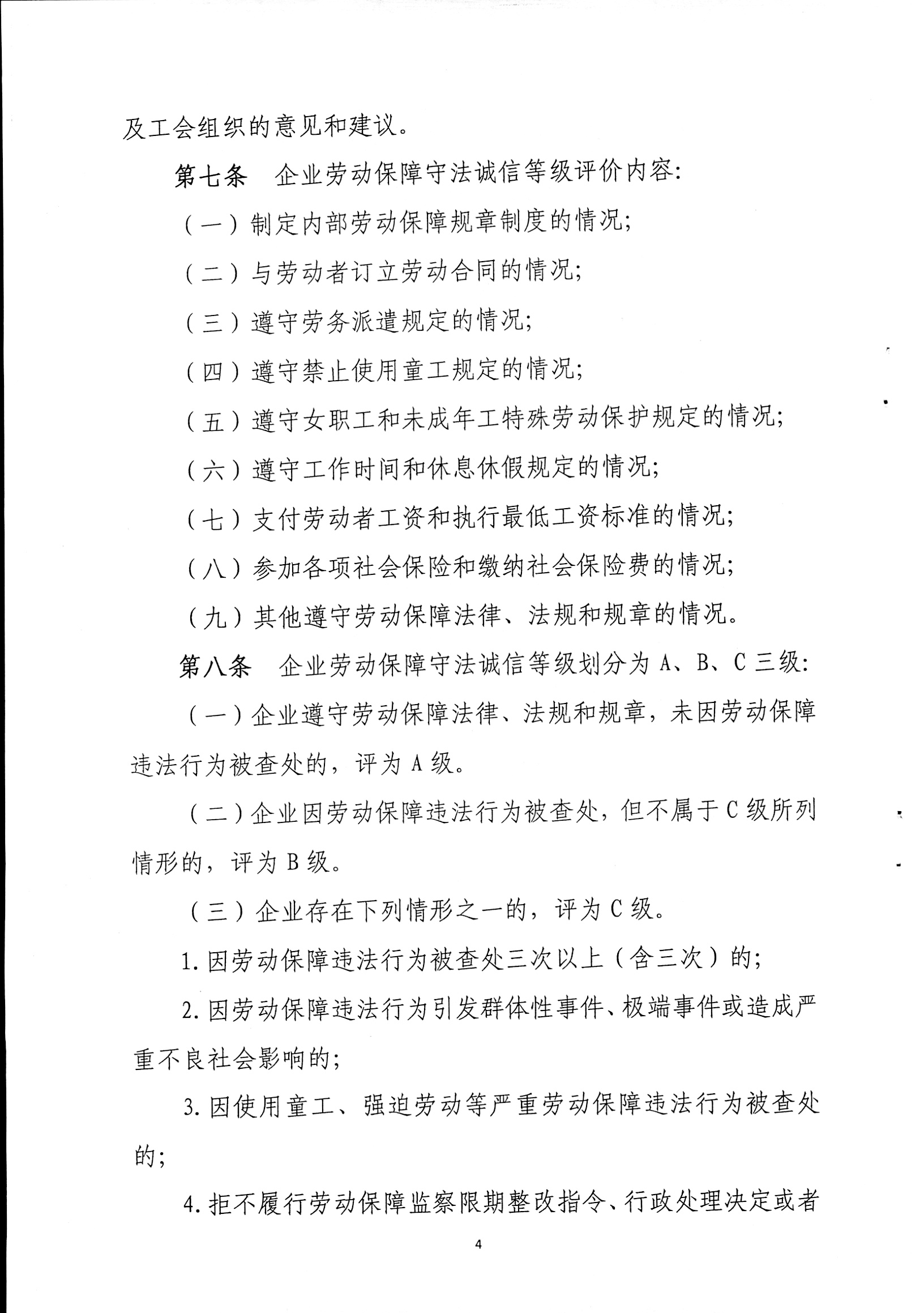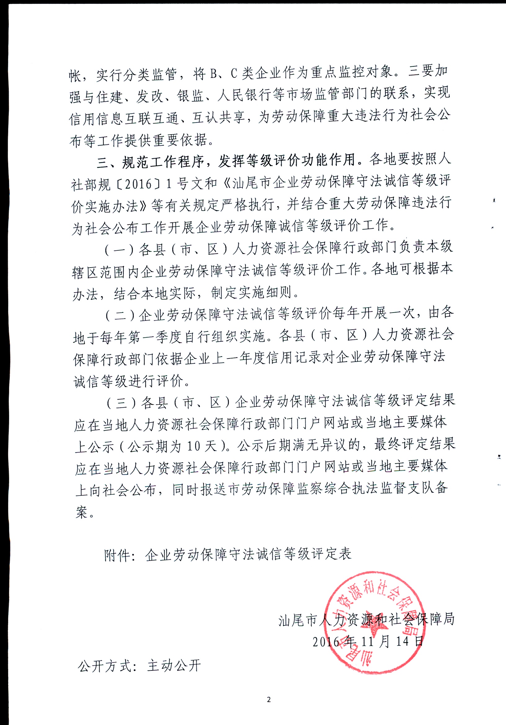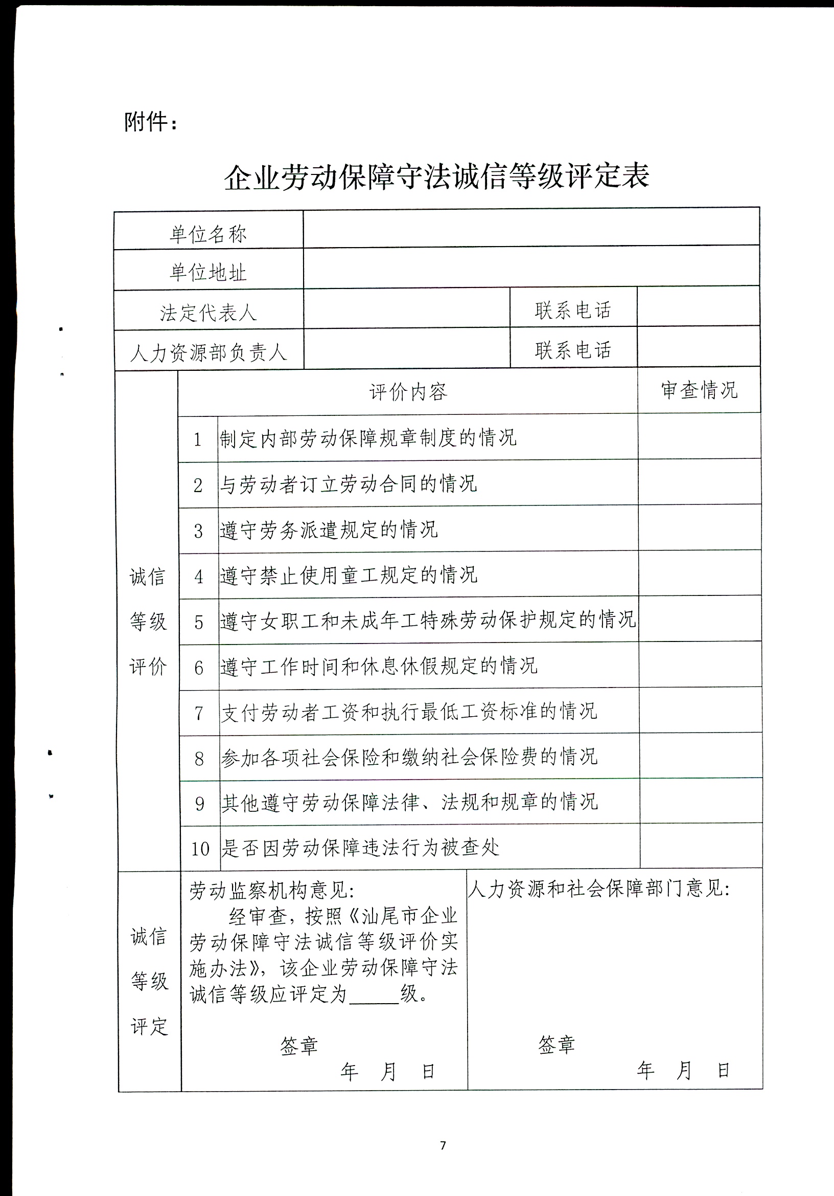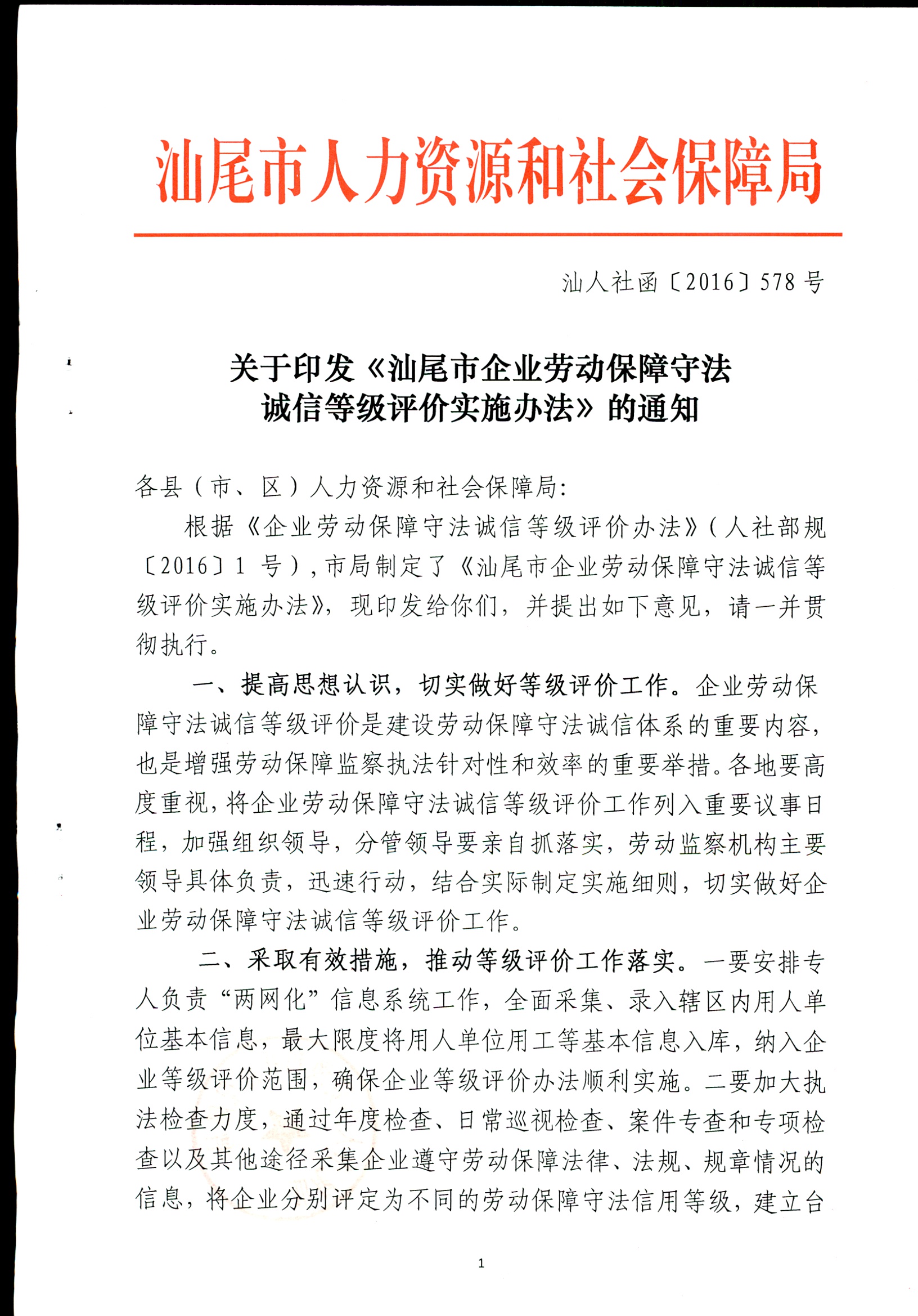 关于印发《汕尾市企业劳动保障首发诚信等级评价实施办法》的通知