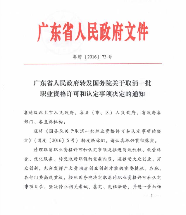 广东省人民政府转发国务院关于取消一批职业资格许可和认定事项决定的通知(粤府[2016]73号).pdf