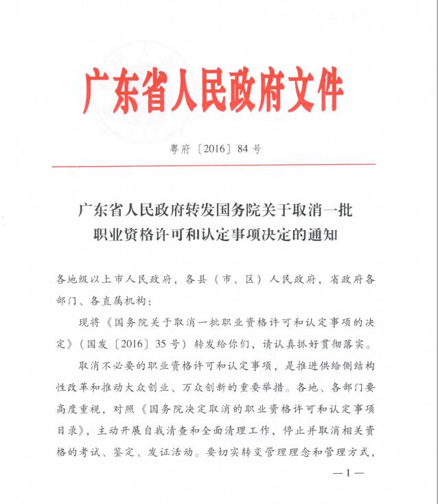 广东省人民政府转发国务院关于取消一批职业资格许可和认定事项决定的通知(粤府[2016]84号)