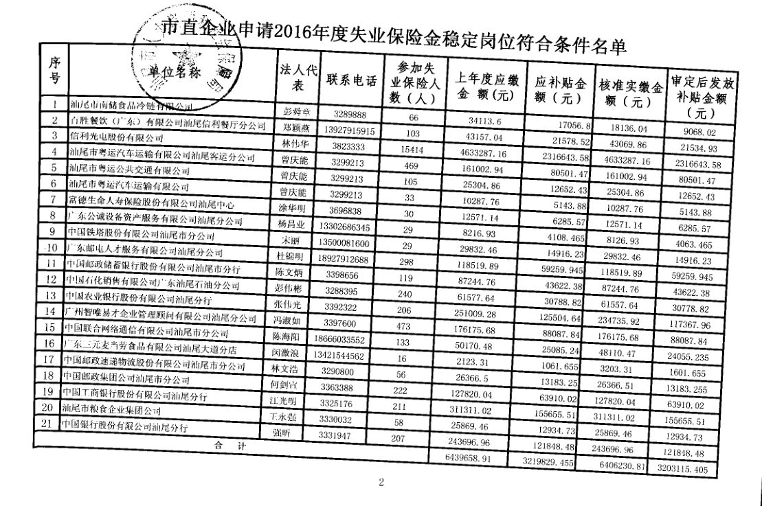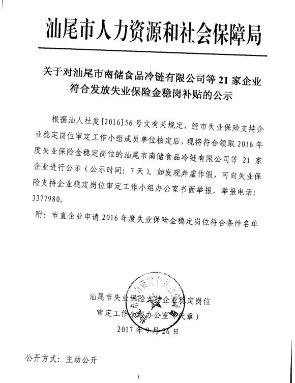 关于对汕尾市南储食品冷链有限公司等21家企业符合发放失业保险金稳岗