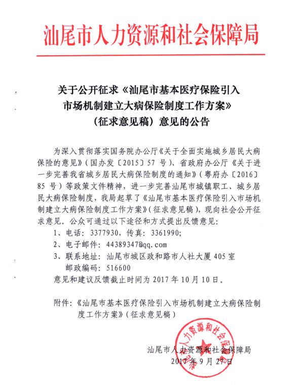 关于公开征求《汕尾市基本医疗保险引入市场机制建立大病保险制度工作方案》(征求意见稿)意见的公告