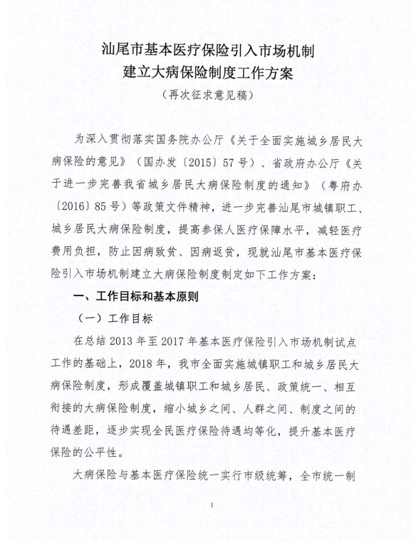 关于再次公开征求《汕尾市基本医疗保险引入市场机制建立大病保险制度工作方案》(再次征求意见稿)意见的公告