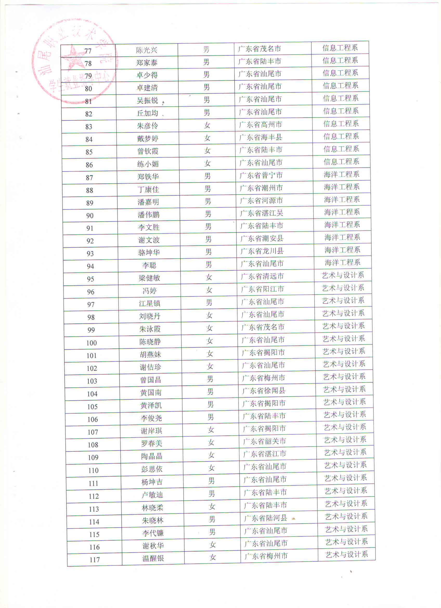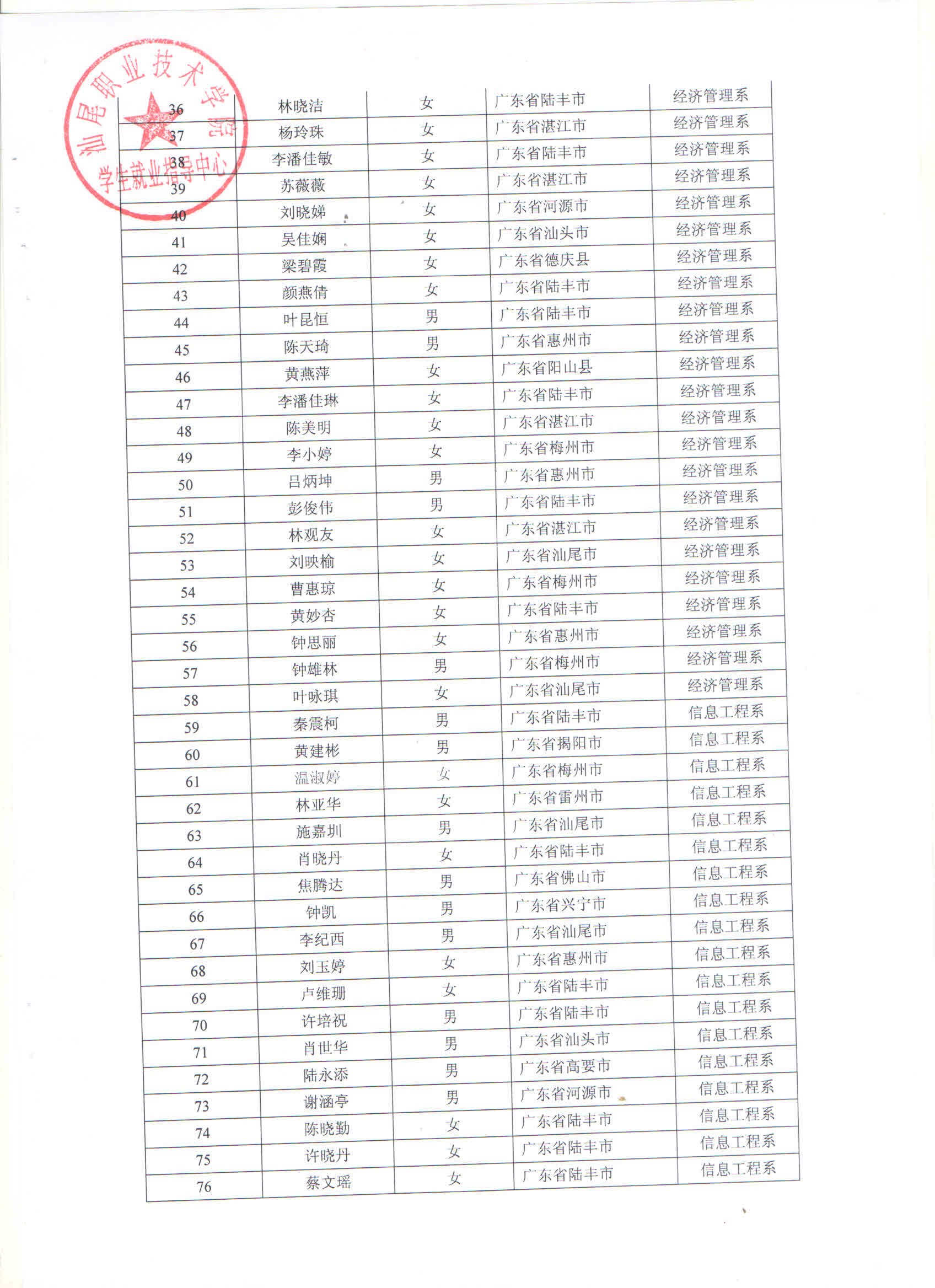 汕尾职业技术学院申请吴丽青等147名困难家庭高校毕业生求职创业补贴220500元(一次性每人标准1500元,附名单)。根据市人力资源和社会保障局、市财政局《关于明确就业创业专项资金补贴项目申请和核发有关事项的通知》(汕人社发〔2015〕165号)规定,拟同意在就业专项资金列支,拨付汕尾职业技术学院求职创业补贴220500元,由汕尾职业技术学院将补贴发放给吴丽青等147名困难家庭高校毕业生本人。现予公示。公示时间:5日(2018年11月22日至28日)