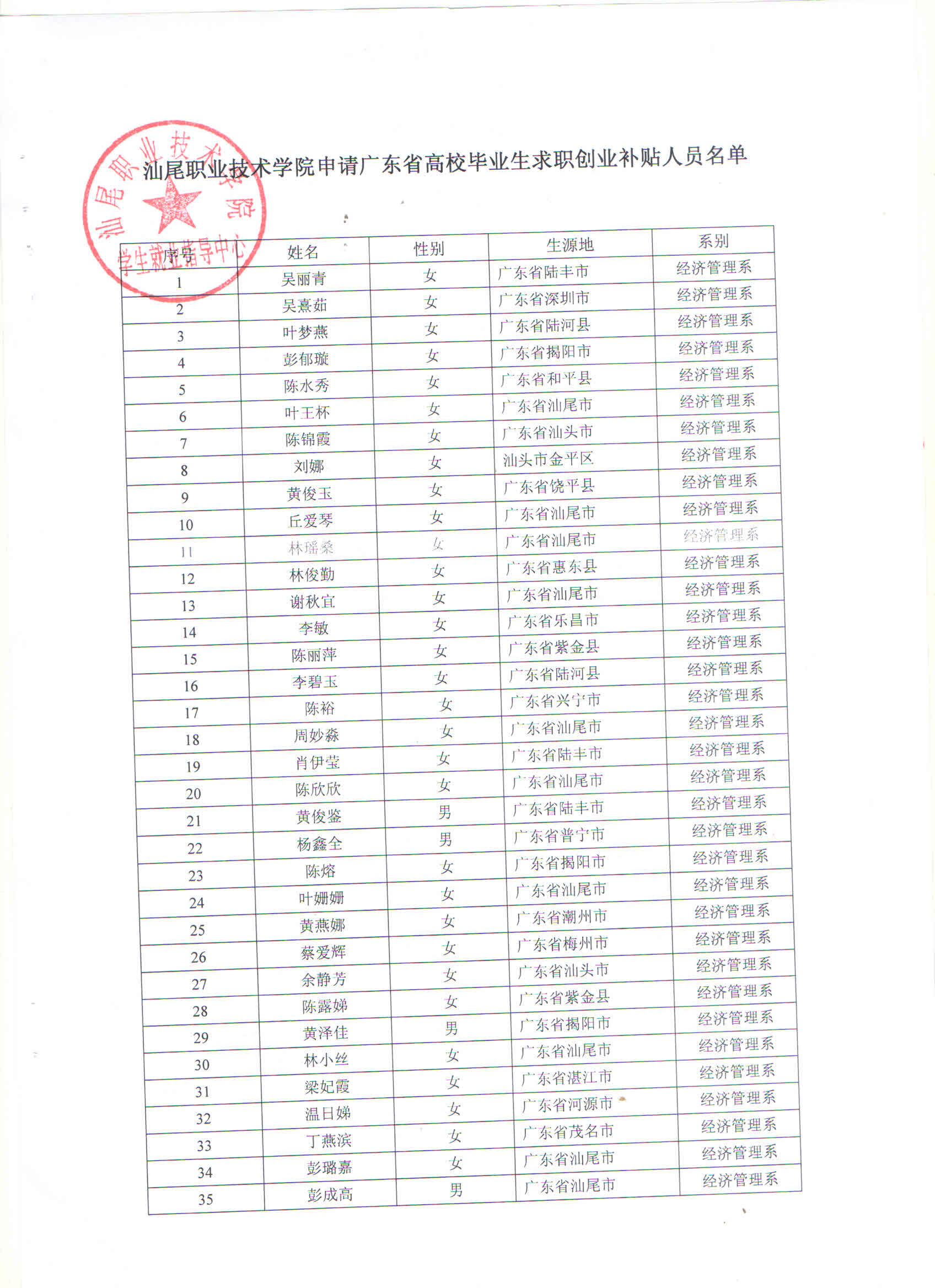 关于汕尾职业技术学院申请求职创业补贴的公示