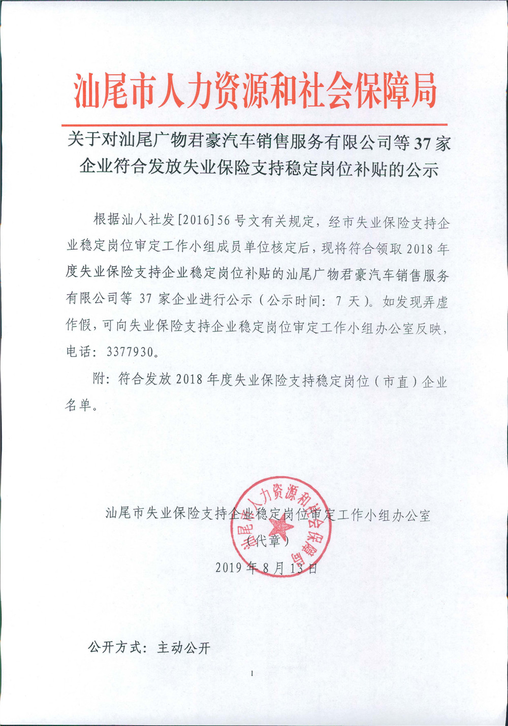 关于对汕尾广物君豪汽车销售服务有限公司等37家企业符合发放失业保险支持稳定岗位补贴的公示