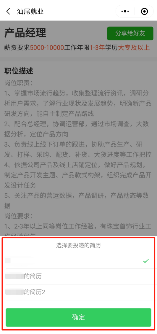 【步骤四】点击“投递简历”,选择要投递的简历,点击“确定”即可完成求职申请。
