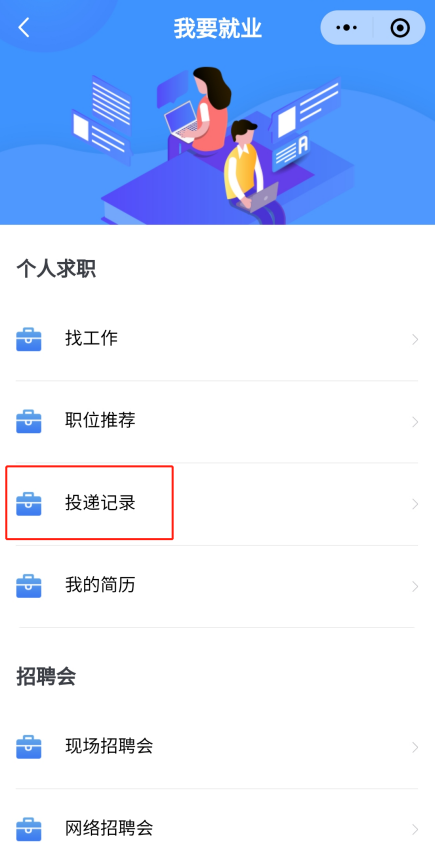除了“找工作”,“我要就业”应用程序还为求职者提供了“职位推荐”“投递记录”“我的简历”三项求职就业服务。