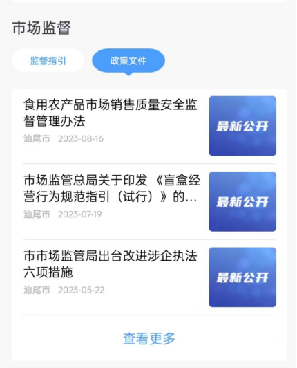 在市场监督服务场景中,市民群众可通过政策文件主题及时、准确知晓市场监管最新的相关政策法规,从而打通政策公开“最后一公里”;通过监督指引主题,充分发挥社会监督引领作用,市民群众可就消费者权益争议、涉嫌违反市场监管法律、法规、规章等线索向市场监管部门进行投诉举报。市场监督服务场景与人民群众生活息息相关,截至目前,政策文件主题共计发布了32条市场监管相关政策法规,切实提高了人民群众的市场监督参与度,保障了人民群众的合法权益。