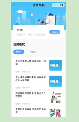 在消费维权服务场景中,维权案例主题可向群众普及消费维权知识,让群众了解消费维权案例,提振群众消费维权的信心;黑榜企业主题可进一步规范企业诚信经营,增加企业失信成本,促进营造规范公平,活跃有序的市场环境;投诉举报渠道主题实现了一键拨打12345投诉举报热线功能,群众可就消费者权益争议、涉嫌违反市场监管法律、法规、规章的线索向市场监管部门进行投诉举报。该场景与人民群众生活息息相关,营造了维护消费者权益,提高消费者维权意识的良好氛围,切实保障了人民群众的切身利益,打造了安心消费的市场环境,是我局推动落实“我为群众办实事”实践活动的重要举措。