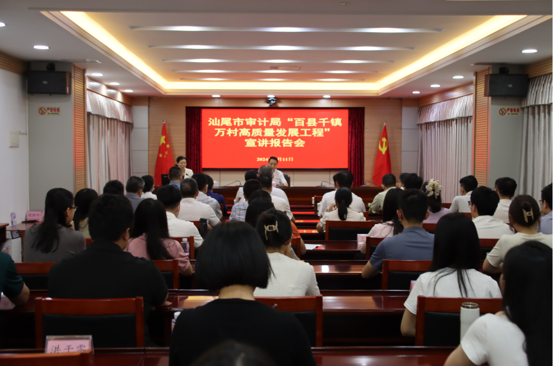 会议强调,全体审计干部要以此次宣讲报告会为契机,进一步深入学习贯彻省委、市委关于“百千万工程”的工作部署,切实把“百千万工程”作为当前和今后一个时期的重要任务来抓,聚焦审计主责主业,主动谋划,积极履职,有效作为,全面履行审计监督职责,助力“百千万工程”加力提速,推动区域协调发展不断取得实质性进展、阶段性成果。要实施好对“百千万工程”政策落实和资金管理使用情况跟踪审计,高度关注各地各单位推进“百千万工程”政策措施落实情况,尤其是工程推进和资金使用情况,确保我市“百千万工程”各项措施任务落地落实见成效;要聚焦大力发展富民兴村产业,开展2023年全市乡村产业发展专项审计调查,严肃查处乡村振兴领域不正之风和“蝇贪蚁腐”等腐败问题,加快推动县镇村高质量发展和农业强市建设;要围绕高起点建设绿美城乡,开展领导干部任期履行自然资源资产责任审计和绿美生态建设情况专项审计调查,推动全面实施绿美汕尾建设;要立足持续完善基础设施建设体系和公共服务供给,开展基础教育、健康养老服务体系建设等,提高相关资金使用规范性和效益,加快补齐教育、医疗等公共服务领域短板弱项。
