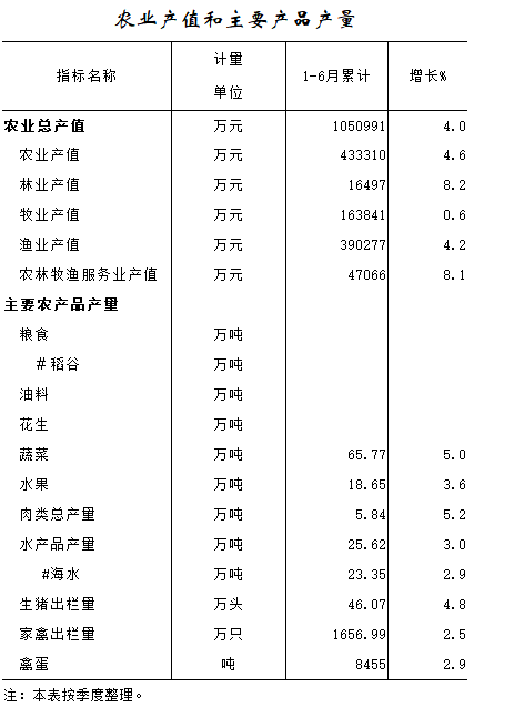 2016年1—7月农业产值和主要产品产量