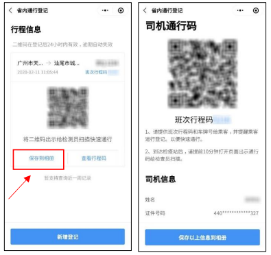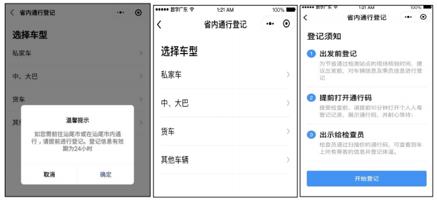车辆“通行登记”操作指南   一、“粤省事”小程序“省内通行登记操作步骤    (一)进入“省内通行登记”服务   扫描下方二维码,或微信搜索“省内通行登记”,或在 “粤省事”微信小程序汕尾专版首页中,选择 “专区”模 块 ——“疫情防控服务专区”--“省内通行登记(汕尾试 点)”服务,实名认证登录办理:            (二)“粤省事”微信小程序实名认证注册/登录流程   进入对应服务后,如提示“本次操作需要您进行登录验 证”,点击“确定”,并根据界面相应提示实名认证,首次登 录请按照提示绑定手机号码(已注册用户略过此步)。   1.阅读,点击同意事项,并点击“开始登录”。      2.绑定手机号后,点击“同意授权”,进入下一步。      3.输入微信支付密码,完成登录,如无法登录,请确认 是否为本人登录及绑定本人的银行卡。      (三)私家车、货车、其他非营运车辆进入群体(含同乘 用户)   流程一:出行前。   驾驶员:在“粤省事”实名认证后,阅读登记须知,登记 车牌号、出发地目的地,并添加乘车人(姓名、身份证) 的部分或者全部信息。   1.进入“省内通行登记”,选择对应车型,阅读须知。      2. 填写驾驶人信息,如独自驾驶,确认无误后可直接提交。      3.如有同行乘客:由驾驶员点击“下一步,录入同乘 人信息”,统一添加填写同行乘客相关信息,填写同乘人姓 名后,根据同乘人年龄段选择身份,并根据提示填写证件 号码及手机号码,可添加多位乘客信息,确认后可直接提 交,提交后建议保存二维码至本地,以加速通行。          流程二:在检查站配合检查。   到达检查站,驾驶员在“粤省事”的“省内通行登 记”界面,即可出示对应二维码,为加速办理通行,建议 用户可点击“保存到相册”,将二维码提前保存至手机,点 击“查看详情”,可查询该条记录详情信息;检查员扫码核 验即可带出全车人员登记信息,然后测量体温、提交信息 后通过。    如图:出示二维码界面(以私家车为例)      (四)中巴、大巴客车等营运交通工具的群体   流程一:出发前。   1.驾驶员    驾驶员在“粤省事”实名验证登录后,选择“省内通 行登记(汕尾试点)”——“中、大巴”,底部弹窗选择 “我是司机”,阅读须知,并填写登记信息,确认无误后可 提交,为加速通行,建议驾驶员可在提交后即时保存二维 码至手机本地,后续需向乘客提供班次行程码及车牌号, 用于乘客办理入粤登记。   如图:入粤登记界面、登记须知、驾驶员信息填写界面      2. 乘客   乘客在“粤省事”实名验证登录后,选择“省内通行 登记(汕尾试点)”——“中、大巴”,底部弹窗选择“我 是乘客”,向司机索取行程码及车牌号,填入后,再填写个 人登记信息,确认无误后可提交。或者由同车人员代为登 记。   如图:入粤登记界面、车辆信息填写界面、个人信息填写界面      流程二:在检查站配合检查。   驾驶员及所有乘客在“粤省事——疫情防控服务专区 ——省内通行登记(汕尾试点)” 入口,即可出示对应二维码,为加速办理通行,建议用户可点击“保存到相册”, 将二维码保存至手机,点击“查看详情”,可查询该条记录 详情信息;检查员扫描司机的二维码核验即可带出全车人 员登记信息,然后测量体温、提交信息后通过。   如下图:选择通行码界面、司机通行码      如下图:选择通行码界面、乘车二维码       二、常见使用答疑    1.如何找到“粤省事”小程序,并进入办理省内通行登 记服务?   答:用户(除检测员群体)可在微信搜索界面,搜索“粤 省事小程序”,选择进入主界面,并下滑至【抗击疫情】—— “省内通行登记(汕尾试点)”,使用微信支付密码实名登录 后(需为本人登录及绑定本人银行卡),根据界面提示进行办 理。   2.支持哪些人士办理,有无户籍、城市等限制?   答:支持持有有效二代居民身份证的用户实名认证后办 理,无城市、户籍限制,暂不支持未申领身份证的婴幼儿、 港澳、台湾人士及外籍人士办理,因此婴幼儿、港澳人士、台湾人士、外籍人士等人群,敬请根据防疫站工作人员指引 通行。   3.省内通行登记是否支持代办?   答:私家车/货车/其他类型车辆需由司机统一代全车人 员办理;中、大巴车乘客如有多人同行,可由同行人代为办 理。   4. 同乘人员有无人数限制,漏填或错填信息怎么办,登 记成功后是否能取消和修改?二维码有有效期吗?   答:同乘人无添加人数限制,已经登记成功的暂时无法 取消和修改,建议由驾驶员重新登记提交全部人员信息,并 出示对应二维码给检查员。 进行省内通行登记以后将生成独立二维码,行程二维码 在登记成功后 24 小时内有效,逾期自动失效。   5.如遇体温信息错误,可修改检查记录吗?   答:如经核实被检人员信息错误需修改,仅支持检查员 在历史纪录中找回并修改提交。   6.如提交失败如何处理?   答:请确认是否网络导致,建议切换网络或前往良好 的网络环境再作尝试。   7.在粤省事使用微信支付密码登录安全吗?   答:粤省事为广东省人民政府主办的移动政务服务平 台,保障您的信息安全,本次使用微信支付密码登录,仅为了让您快速实名验证进行办理“省内通行登记”服务,请放 心使用。   8.从省外入汕,先到汕尾市 A 地,再到汕尾市 B 地,怎 么填?   答:填写 A 地,即初始进入汕尾市界所在地市为准。   9. 不登记可以入汕尾市吗?本来就是汕尾的车牌,进 入
