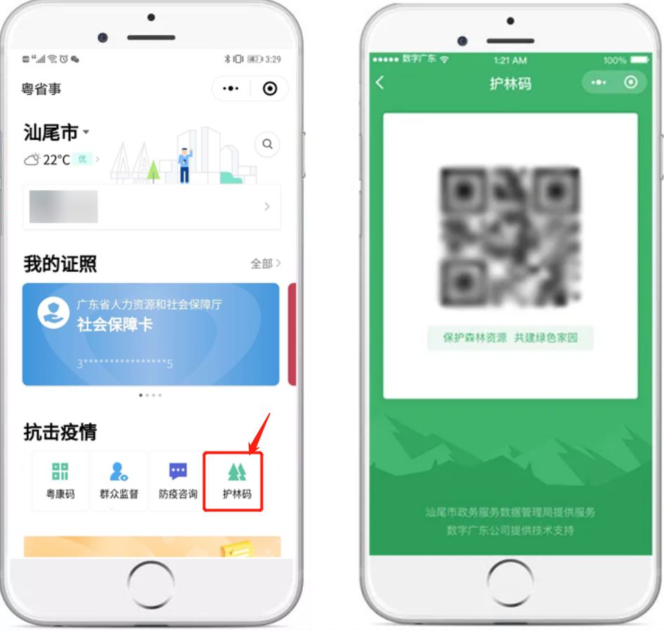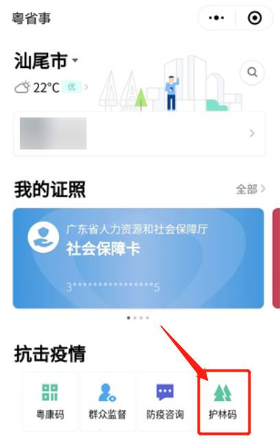 (2)汕尾市民也可以从汕尾疫情防控服务专区进入:微信搜索“粤省事”小程序,首页左上角切换城市至汕尾市,下滑在“专区”版块,点击进入“汕尾疫情防控服务专区”,下滑找到“护林码”服务。