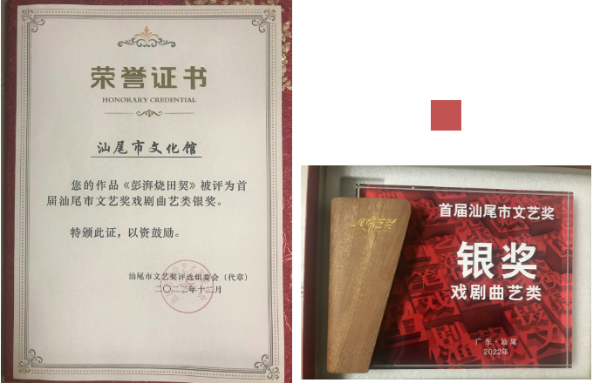 4月21日下午,由中共汕尾市委、汕尾市人民政府主办,中共汕尾市委宣传部、汕尾市文学艺术界联合会、汕尾市文化广电旅游体育局承办的首届汕尾市文艺奖颁奖典礼在汕尾马思聪艺术中心隆重举行,我馆创作的小戏《彭湃烧田契》获得戏剧曲艺类银奖,联合城区舞协创作的舞蹈《太阳最红》获得舞蹈类银奖。