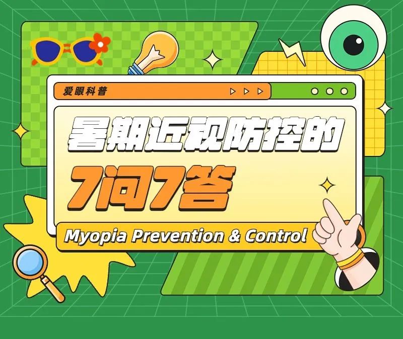 Q1 为什么说暑假是近视防控的关键期? 暑假时间长、天气热,儿童青少年容易出现生活不规律、缺少户外活动、长时间室内近距离用眼等情况,易发生近视或近视程度加深。倡导家长树立科学育儿理念,在暑假期间加强亲子交流,引导儿童青少年合理规划暑假生活、规律作息,积极参加体育锻炼、家务劳动、社会实践、公益活动等。 Q2 暑假天气太热不想出门,室内活动可以预防近视吗? 户外阳光会刺激人体分泌多巴胺,一种在脑细胞之间传递信号并在眼睛发育中起作用的化学物质。在动物研究中发现,被激活的多巴胺,可以减缓眼睛轴长增加,使其保持更健康的形状。 室内活动近视防控效果不理想。室内活动视野不开阔,光照强度不够,而户外活动时光照充足才是预防近视的关键。夏季天气炎热,可以选择每天在太阳光照不太强烈的时间到户外活动。居家可到阳台或窗边,多接触阳光。 Q3 暑假在家,视屏时长多久合适? 观看电子屏幕要适时休息,建议看屏幕20分钟后,抬头远眺20英尺(6米)外至少20秒以上,即“20—20—20”口诀。3岁以下儿童避免接触电子产品,学龄前儿童尽量少使用电子产品。儿童青少年每天娱乐性视屏时间累计不超过1小时。 Q4 选择电子产品有要求吗? 选择电子产品,建议使用次序为投影仪、电视、电脑、平板、手机。总体原则是屏幕越大,分辨率越高越好,根据环境调整亮度。周围环境较暗时,要打开房间灯光照明,避免在过暗的环境下使用电子产品。 Q5 电子设备的“护眼模式”能保护眼睛吗? 电子产品的“护眼模式”是通过屏蔽蓝光,调节屏幕亮度来护眼的。长时间、近距离使用电子产品,会引起视疲劳,加深近视程度。 Q6 观看电视电脑时,距离多远合适? 观看电视时,眼睛应距离电视屏幕3米以上或6倍于电视屏幕对角线的长度。观看电脑时,眼睛离电脑屏幕的距离应大于50cm(约一臂远),视线微微向下,电脑屏幕的中心位置应在眼睛视线下方10cm左右,能有效减轻眼睛干涩、视疲劳等。 Q7 假期预防近视,膳食要注意哪些? 家长要做到食谱多样化,营养均衡,引导孩子不挑食、不偏食,多吃蔬菜水果,适量摄入鱼类、豆制品和鸡蛋等优质蛋白,也可适量食用胡萝卜、蓝莓等富含对眼睛有益维生素的食物。少摄入甜食、碳酸饮料和油炸食品。
